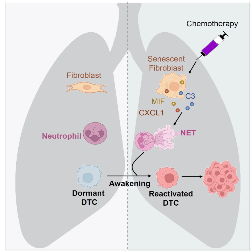 Con esta novedosa herramienta, los investigadores del equipo de Hu Guohong proporcionaron la evidencia del despertar latente del DTC después de la quimioterapia que resultó en una recaída pulmonar. También revelaron el mecanismo que impulsa este despertar, que implica la senescencia de fibroblastos y la formación de trampa extracelular de neutrófilos (NET).